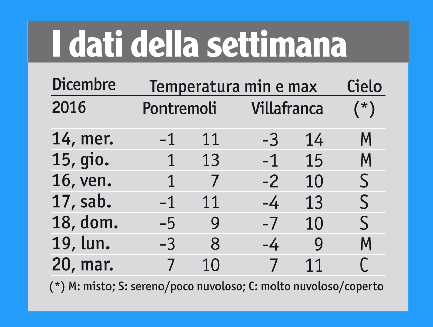 L’ultimo ‘vetroghiaccio’ pontremolese di una certa portata risale al 30-31 dicembre 1995, ma ancora più gravoso fu quello straordinario del 28 febbraio-1° marzo 1986. Altri eventi di pioggia congelantesi si ebbero, in dicembre, negli anni 1978, 1981 (il 22, dopo una nevicata di 50 cm che rese indimenticabile quel Natale) e 1983. Infine, a completamento della cronaca, il sistema perturbato in azione martedì 20 sulle regioni più occidentali d’Italia, ha recato piogge e nevicate tra Liguria e Piemonte, rovesci intensi in Sardegna e fenomeni marginali in Emilia, Lombardia e Toscana.