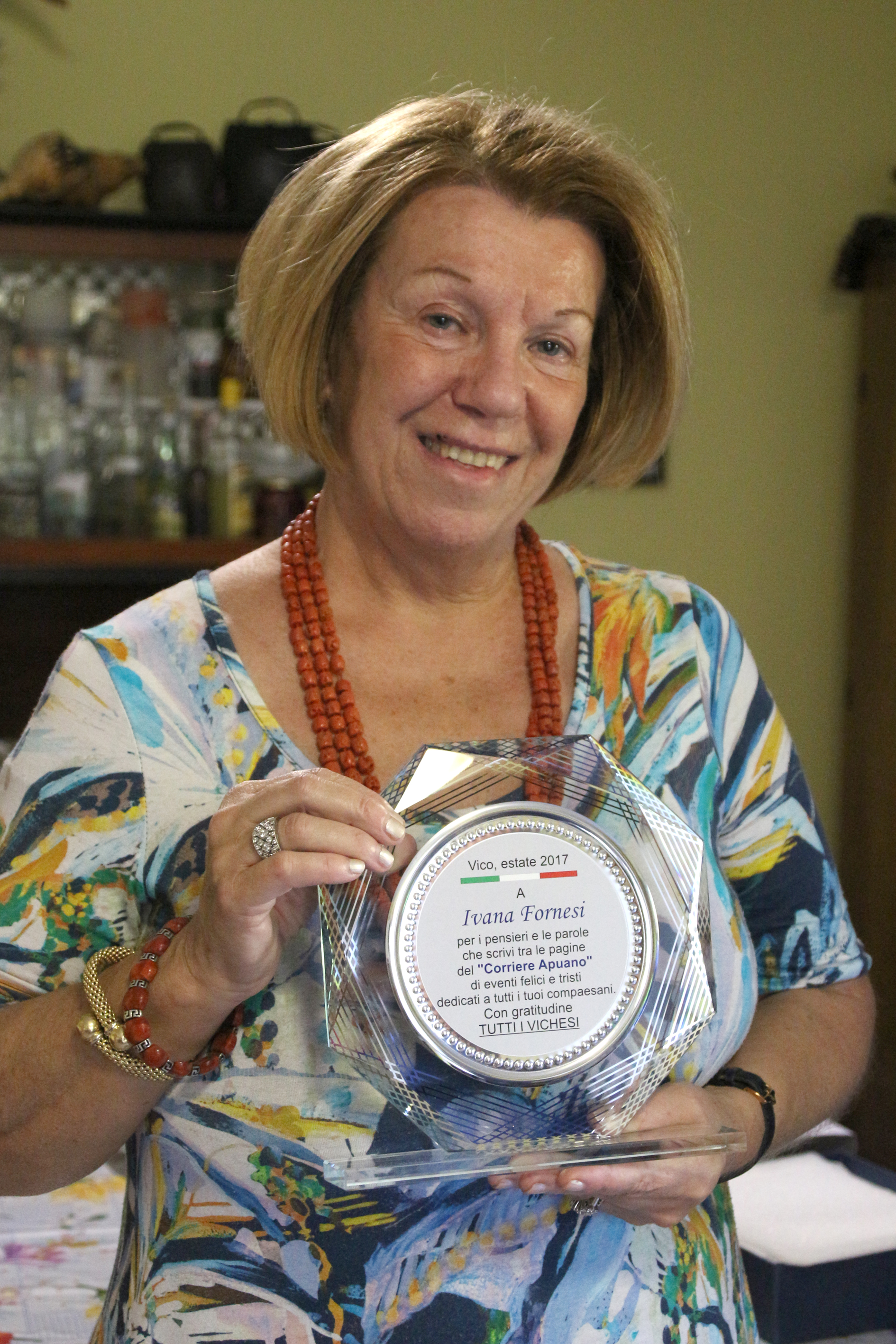 Era il 1977 quando Ivana Fornesi cominciò a scrivere di cronaca locale sulle colonne del Corriere Apuano, sotto la guida del direttore don Pietro Tarantola. La comunità di Vico, grata per la particolare attenzione dedicata da Ivana al suo territorio di origine, ha concretizzato la sua riconoscenza con una bella targa, che le è stata consegnata dall’assessore Rita Beccari, in rappresentanza del sindaco Carletto Marconi, a nome di tutti i vichesi e dell’amministrazione comunale di Bagnone; la fascia tricolore ha conferito ufficialità a una cerimonia semplicissima. Gli amici vichesi hanno fatto una sorpresa a Ivana invitandola a casa del cugino Mario Pini, purtroppo scomparso pochi giorni dopo, e le hanno fatto dono dell’artistico oggetto per ringraziarla – come recita la dedica – “per i pensieri e le parole che scrivi tra le pagine del ‘Corriere Apuano’, di eventi felici e tristi, dedicati a tutti i tuoi paesani”. (i.t.)