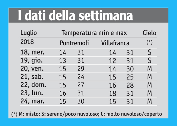 30meteoDigitando le lettere dello stato del cielo (ed anche per essere stati costretti ad annullare l’escursione programmata) in questa settimana di luglio, ne è balzato agli occhi l’andamento. E’ capitato proprio così: pieni di sole sono stati sia mercoledì 18 che giovedì 19, ventilati, asciutti, dai pomeriggi caldi preceduti e seguiti rispettivamente da piacevoli mattini e da fresche serate.