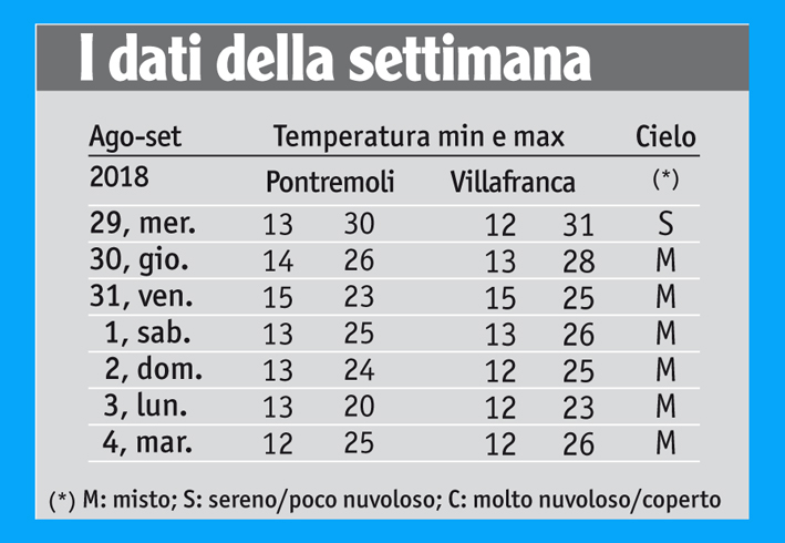 33meteo_TABELLAIl mese di agosto 2018, fra i più caldi registrati in decenni di osservazioni, ha presentato una temperatura media (23,4 °C a Pontremoli-Verdeno e 23,5 °C a Villafranca-Ghiaione) simile a quella dell’agosto 2017, anche se quello dello scorso anno fu più torrido per la pioggia più scarsa e l’aria più secca.