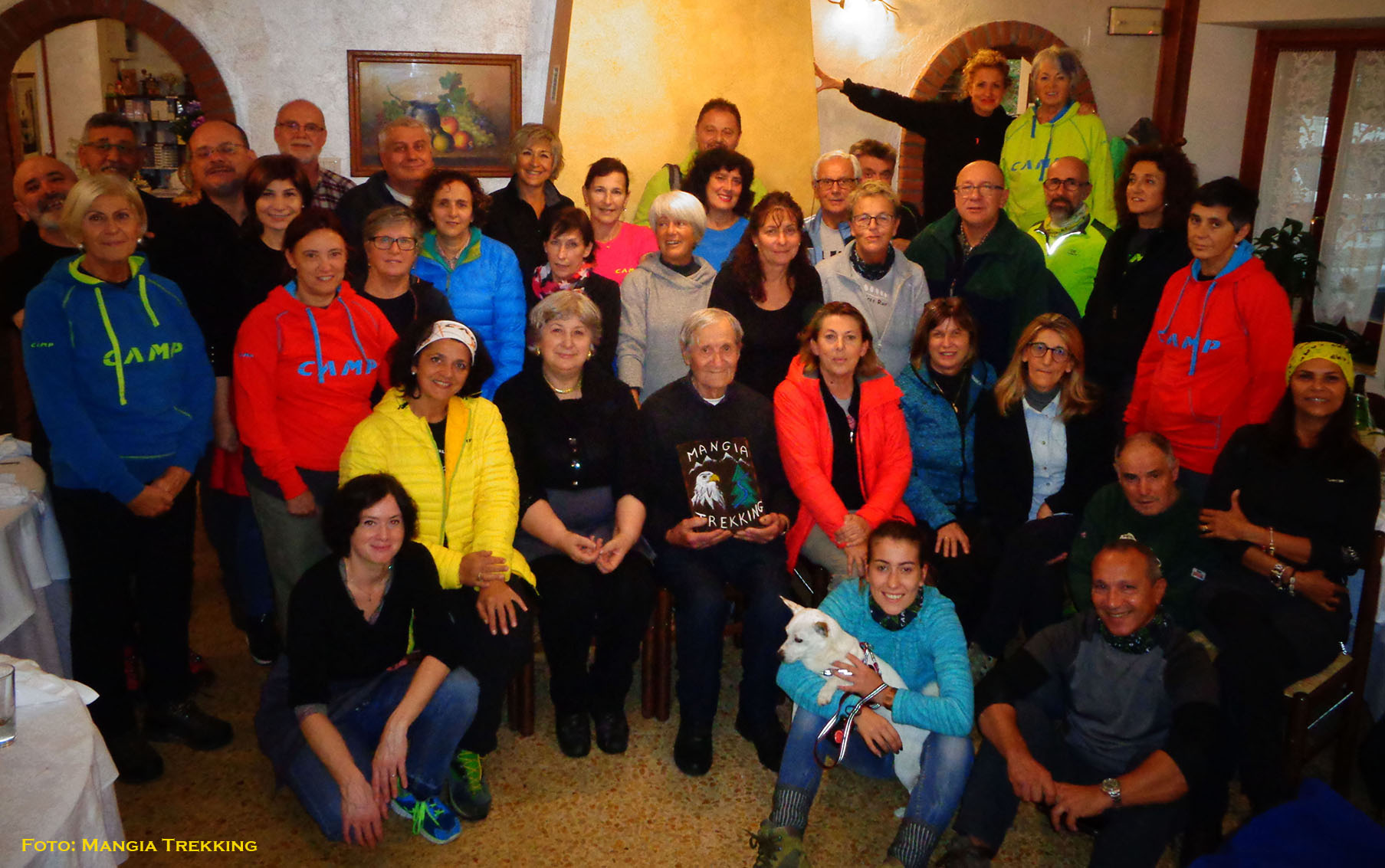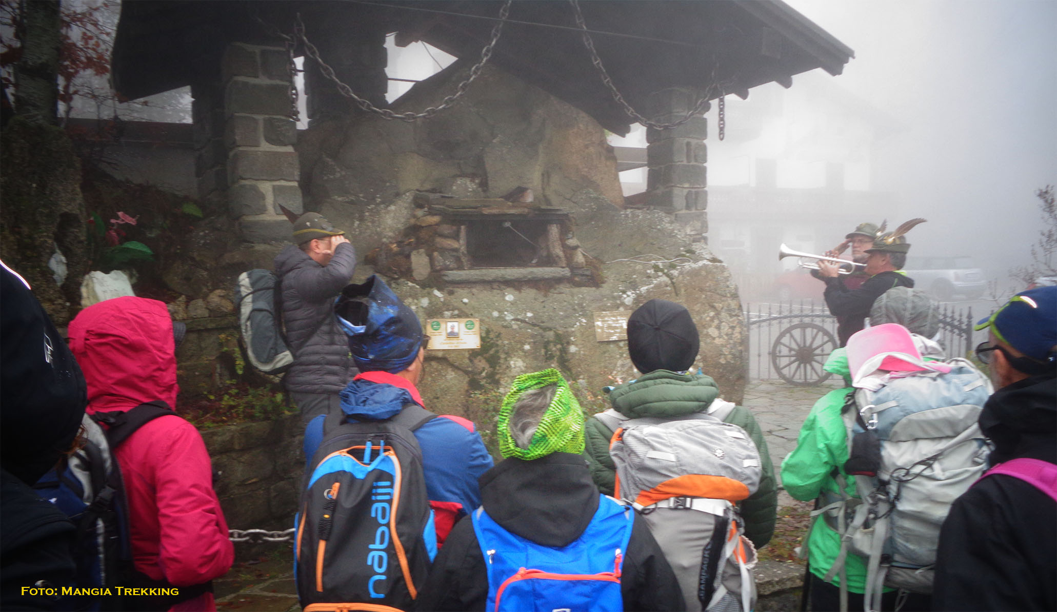 Un momento solenne al monumento agli alpini di Cerreto Laghi, nella chiesetta consacrata alla Madonna della neve in occasione del IV Novembre. Raccolti ed ascoltando la tromba dell’associato Gabriele Morini, che eseguiva il silenzio, per ricordare tutti i caduti della Prima Guerra Mondiale. In montagna anche per commemorare uno dei “padri ispiratori” della loro associazione, l’alpino Antonio Cerchi deceduto in Ortigara. Così è cominciata la giornata nell’Appennino Tosco Emiliano, dell’associazione Mangia Trekking. Dopo l’importante celebrazione, i partecipanti all’iniziativa si sono diretti verso una storica trattoria, dove è stato festeggiato il consolidamento di un nuovo punto di riferimento e d’incontro dell’associazione. Una rappresentanza di La Spezia, Massa Carrara e di Reggio Emilia, nonostante le non buone condizioni meteo ha voluto esser presente, per evidenziare l’importanza di questi esercizi di ricezione turistica. Un servizio sociale, strutture importanti per la vita delle comunità della montagna. Con una ricca degustazione di prodotti tipici della montagna, cucinati secondo antiche ricette, la consegna di alcuni premi ai presenti, inviati per la circostanza da alcune aziende di cui l’associazione è testimonial, e la consegna del crest di Mangia Trekking alla proprietaria del locale, Tilde Ferretti Incerti, si è andata concludendo l’iniziativa.