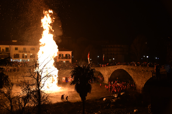 06falò_SanGeminiano7La dimensione dello stupore si è bloccata lì, nella coinvolgente meraviglia che godeva dello scoppiettio degli “úlzi” e delle falupe che, salite in alto, ricadevano quasi su se stesse ad aumentare l’imperdibile scenografia. Quando sono saliti i cori di parte, si avvertiva chiaramente la profonda commozione di chi tentava di esaltare l’impresa con un consenso che usciva dalle regole della contrapposizione perché la contesa era già risolta. Più le fiamme si ingigantivano, libere di volare senza ostacolo di sorta, più avvertivi nei commenti degli astanti il senso dello stupore che si moltiplicava nella folla compatta di spettatori, distribuiti su tutti i quattro lati del grande spazio tra i due ponti, per trasformarsi in esaltazione collettiva. Nessuno riusciva a liberarsene, neppure alcuni amici americani, presenti per la prima volta all’evento, costretti ad esternare una marea di aggettivi nella loro lingua per rivelare appieno quanto stavano godendo.