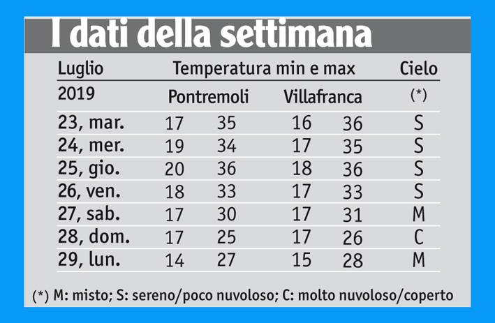 La cronaca prende le mosse dal crescendo di caldo che si è registrato nei giorni dal 23 al 25 luglio. Questa volta, rispetto a giugno, i massimi effetti si sono sentiti un po’ più a nord. Non che sul Mediterraneo abbia fatto fresco, però le temperature vi si sono discostate dalla norma in maniera più contenuta. Il cielo sgombro dal 23 al 26 ha dato modo alla fornace solare di sfogarsi e le temperature sono tornate a raggiungere e a superare i 35°C, livello che non era così comune fino a trent’anni fa, ma che ormai non è raro vedere più volte nel corso della stagione estiva.