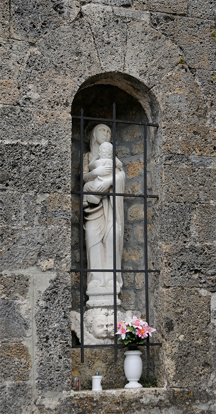 Il paramento murario mostra parti romaniche nelle quali si apre una nicchia con un’antica statua di marmo raffigurante la Madonna col Bambino; ma è soprattutto il bassorilievo in marmo sopra il portale d’ingresso ad attirare l’attenzione. Raffigura San Giorgio nella tipica iconografia di cavaliere che uccide il drago e libera la principessa raffigurata sullo sfondo. L’opera, degli inizi del Cinquecento, è stata oggetto di varie ricollocazioni: in origine infatti si trovava sulla cappella di Cervara (o Corvaria) lungo la strada tra Aiola e Vinca; venne poi spostata nell’eremo di San Giorgio prima di essere murata infine nell’attuale collocazione nel 1814.