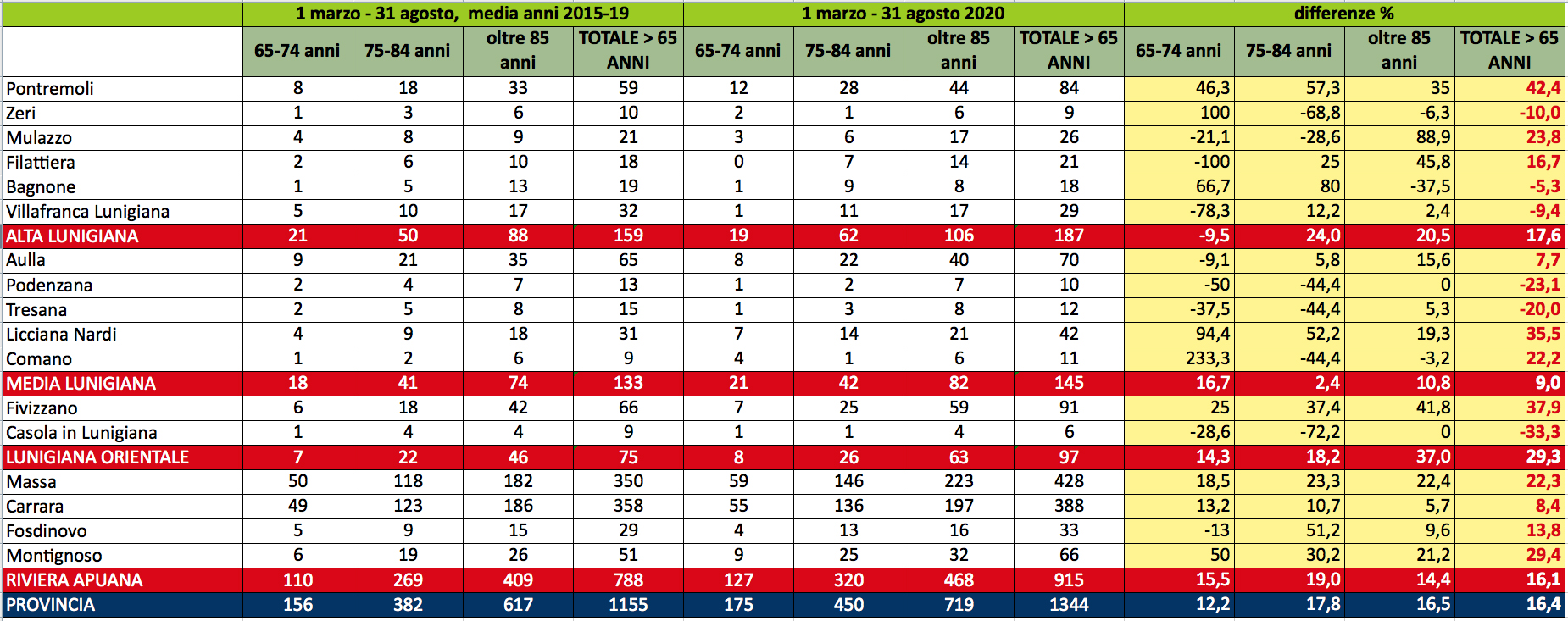 Un’impennata delle morti degli over 65 del 16,4% nella provincia apuana, con un picco del 29,3% nella Lunigiana Orientale. Per chi ancora avesse dubbi sull’incidenza del Covid nella mortalità nella nostra provincia, i dati parlano da soli. E in molti casi sono impietosi. A fornirli sono stati i ricercatori dell’Istituto di Studi e Ricerche (ISR) della Camera di Commercio, che li hanno pubblicati nel Rapporto intermedio sull’economia provinciale presentato lo scorso 17 dicembre. I ricercatori hanno confrontato, comune per comune, la mortalità media dei cittadini ultrassessantacinquenni (ulteriormente suddivisi nelle categorie 65-74, 75-84 e over 85) del periodo 1 marzo – 31 agosto 2020 con i dati medi dell’analogo periodo dei cinque anni che vanno dal 2015 al 2019. I 6 mesi presi in considerazione includono tutto il periodo della “prima ondata” e della fase estiva prima che l’epidemia di Covid-19 riprendesse in tutta la sua gravità. Per rendere più significativo anche il dato dei comuni più piccoli, abbiamo rielaborato i dati aggregando i comuni in 4 zone: Alta Lunigiana, Media Lunigiana, Lunigiana orientale e comuni della Riviera Apuana (compreso Fosdinovo, la cui popolazione, in maggior parte, insiste sulla bassa val di Magra). L’assenza di decimali nel numero medio di decessi 2015-2019 pubblicati dall’ISR rende le percentuali non precisissime ma comunque più che accurate. Dalla necessaria premessa metodologica, passiamo ai dati: Pontremoli (+42,4%), Fivizzano (+37,9%) e Licciana (+35,5%) sono i comuni che hanno visto salire maggiormente la mortalità della popolazione anziana nei 6 mesi considerati.