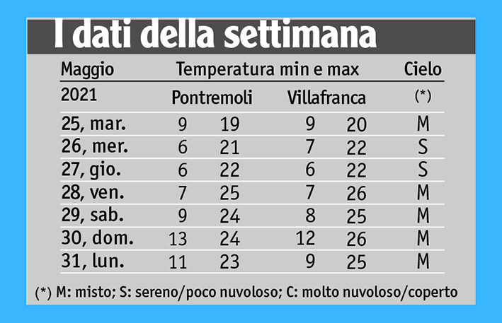 La nuova norma trentennale 1991-2020 pone per il mese di maggio, a Pontremoli, una temperatura media di 15,5°C. Il nostro del 2021, invece, ha faticato ad arrivare a 14°C: con una media delle minime di 8,5°C ed una media delle massime di 19,3°C si ottiene una media mensile di 13,9°C, al di sotto dei canoni suddetti di 1,6°C. Uno scarto negativo che mancava da qualche tempo considerando tutti i mesi dell’anno in generale, mentre, limitatamente ai mesi di maggio, quello del 2019 fu ancor più freddo con una media di 12,9°C. Inarrivabili restano quei mesi di maggio che si fermarono su livelli straordinariamente bassi come il 1984 (11,3°C) e il 1991 (11,5°C).