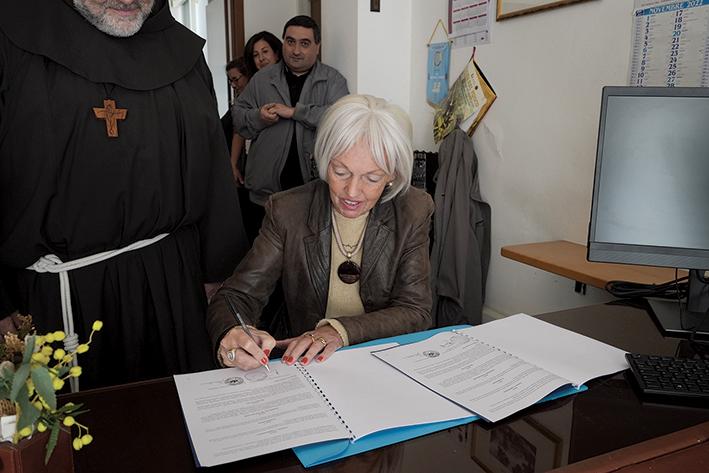 La dirigente Donatella Buonriposi firma l’accordo tra la Diocesi e l’Ufficio Scolastico Provinciale