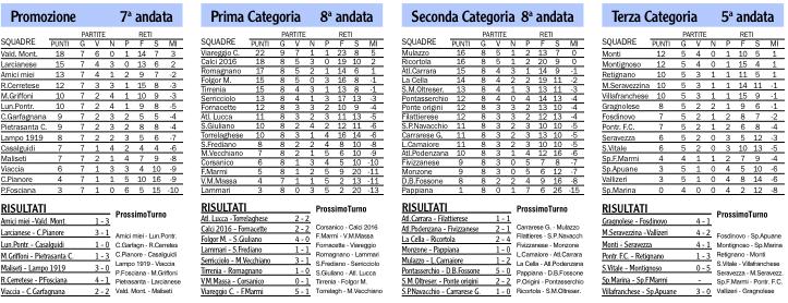 Ora, quindi, la situazione è più positiva ed il futuro, al di là dell’imminente impegno con la terza in classifica, sicuramente più roseo, con la prospettiva che, rientrando tanti titolari e in attesa di rinforzi, la squadra trovi quegli equilibri che Bracaloni desidera e che finora si sono visti solo a sprazzi, nella consapevolezza che, alzando la qualità e assestandosi la preparazione, succeda quel qualcosa che permetta di provare a sognare. Sulla stessa scia si sta muovendo il Serricciolo che, grazie alla convincente vittoria sul Migliarino Vecchiano, sale di prepotenza la graduatoria e si piazza a due sole lunghezze dalla zona play off, come dire del tutto prossimo a quel traguardo che resta l’obiettivo stagionale, ben più in linea con la sua storia usuale. Il tutto ovviamente se sarà in grado di tenere il passo degli ultimi tre impegni, ovvero proporre quella qualità e quella determinazione che sono mancate nella fase di avvio e che sono state la causa prima del ritardo al momento ancora troppo pesante non certo con la prima, già inarrivabile, ma con le altre pretendenti ai posti che contano. Segnali positivi anche dalla Terza dove si mettono in luce Gragnolese, Monti e Villafranchese, la prima per la vittoria sonante nel derby con il Fosdinovo, la seconda per la sicurezza messa in mostra con il Salavetizia e la terza per la concentrazione espressa contro lo Spartak. Un tris di successi che vale piazzamenti di tutto effetto in classifica, specie per quello che possono poter significare in prospettiva. Delusione, invece, davvero sonante, in casa del Pontremoli FC stoppato brutalmente in casa del Retignano proprio nel confronto che doveva dire se la banda di Capiferri aveva davvero i numeri per essere tra le protagoniste del torneo. Niente di compromesso ovviamente, ma certo l’occasione per meditare su quanto successo fino ad oggi e valutare cosa ci si possa aspettare in futuro. Senza storia, invece, la trasferta del Vallizeri in casa del Montagna Seravezzina che conferma una situazione tutta da rivedere per i valligiani, finora davvero sottotono.