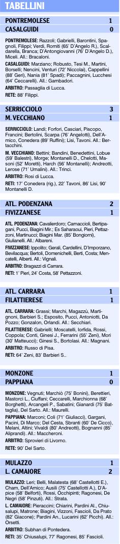 Una discreta Pontremolese, opposta ad un avversario al suo livello, riesce con la determinazione a piazzare l’acuto giusto a due minuti dalla fine per un successo davvero importante. A segno anche il Serricciolo che si avvicina sempre più alla zona calda. In Terza sugli scudi Gragnolese, Monti e Villafranca mentre il Pontremoli segna il passo ad opera del Retignano.