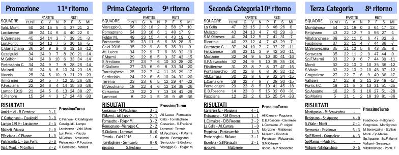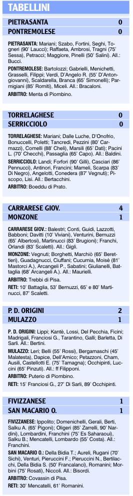 Turno deludente per gli azzurri che, pareggiando a Pietrasanta, perdono il treno nella corsa per la seconda piazza, ma conquistano il primo traguardo stagionale. Per il Serricciolo ancora un pari in bianco, ma la salvezza è ancora da conquistare. Seconda in panne con sconfitte pesanti per Mulazzo e Monzone, mentre la Fivizzanese non va oltre il pari ed esce dalla playoff. In Terza si salva solo la Villafranchese e la corsa per un posto al sole si complica anche per il Fosdinovo. In luce il Pontremoli FC che batte in trasferta lo Sporting.