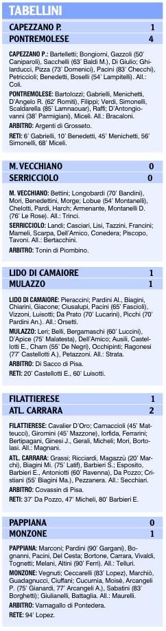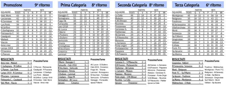 Bella prova esterna degli azzurri che consolidano la zona play off, ma la vetta è lontana. Il Serricciolo pareggia a Vecchiano e resta ai margini della zona play out. Seconda in sofferenza con il solo Monzone che vince in trasferta a prenota la salvezza in diretta. Il Mulazzo si fa rimontare dal Lido di Camaiore e perde terreno rispetto alla capolista. La Filattierese beffata dall’Atletico Carrara. In Terza pareggio tra Villafranchese e Fosdinovo, mentre Monti e Vallizeri vincono e crescono anche se i margini play off si riducono.