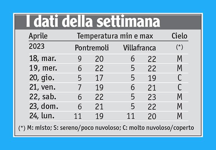 Le temperature massime, in contenuto aumento nella settimana in esame, si sono portate su valori un poco superiori alla norma stagionale; più in linea con le attese sono risultate le temperature minime, eccetto nella notte di lunedì 24, nuvolosa e piovosa, durante la quale si sono tenute sopra i 10°C. I pluviometri, da inizio mese insolitamente poco operosi per la scarsità di… materia prima da registrare, sono entrati in azione lungo la settimana solo due volte. La prima, mercoledì 19, in seguito ad un rovescio verificatosi poco prima delle ore 18 e che ha interessato in particolare l’estremo nord dell’alta valle della Magra, tra Pontremoli e la Cisa, risultando più consistente tra Montelungo e il valico (a Pontremoli, 2,4 mm in Verdeno).