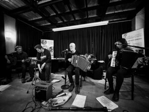 Con Mauro Manicardi hanno suonato Monica Schettino Milton alla fisarmonica, Franco Ressa chitarra e voce, Edoardo Scaletti alle percussioni, e Dario Landi alla piva. Ed ora Sanremo! Aspettiamoci la banalità fatta musica e un’ubriacatura di luoghi comuni; un’ altra musica e un’altra storia quelle di Mauro Manicardi e dei suoi musicisti!