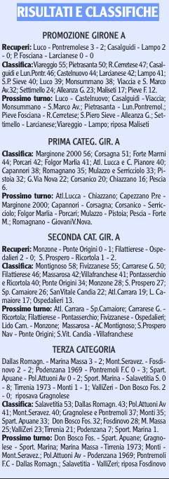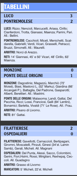 La sconfitta nel recupero della 28° giornata con il Luco taglia fuori matematicamente gli azzurri dalla lotta per la vittoria finale e mette in discussione l’accesso ai play off, ormai l’unico obiettivo importante della stagione. In Seconda la Filattierese batte gli Ospedalieri e resta in corsa per la lotteria finale; il Monzone perde in casa e rientra nel rischio play out. In Terza il Pontremoli sale in quinta posizione ed affianca la Gragnolese. Belle prove di Vallizeri e Fosdinovese.