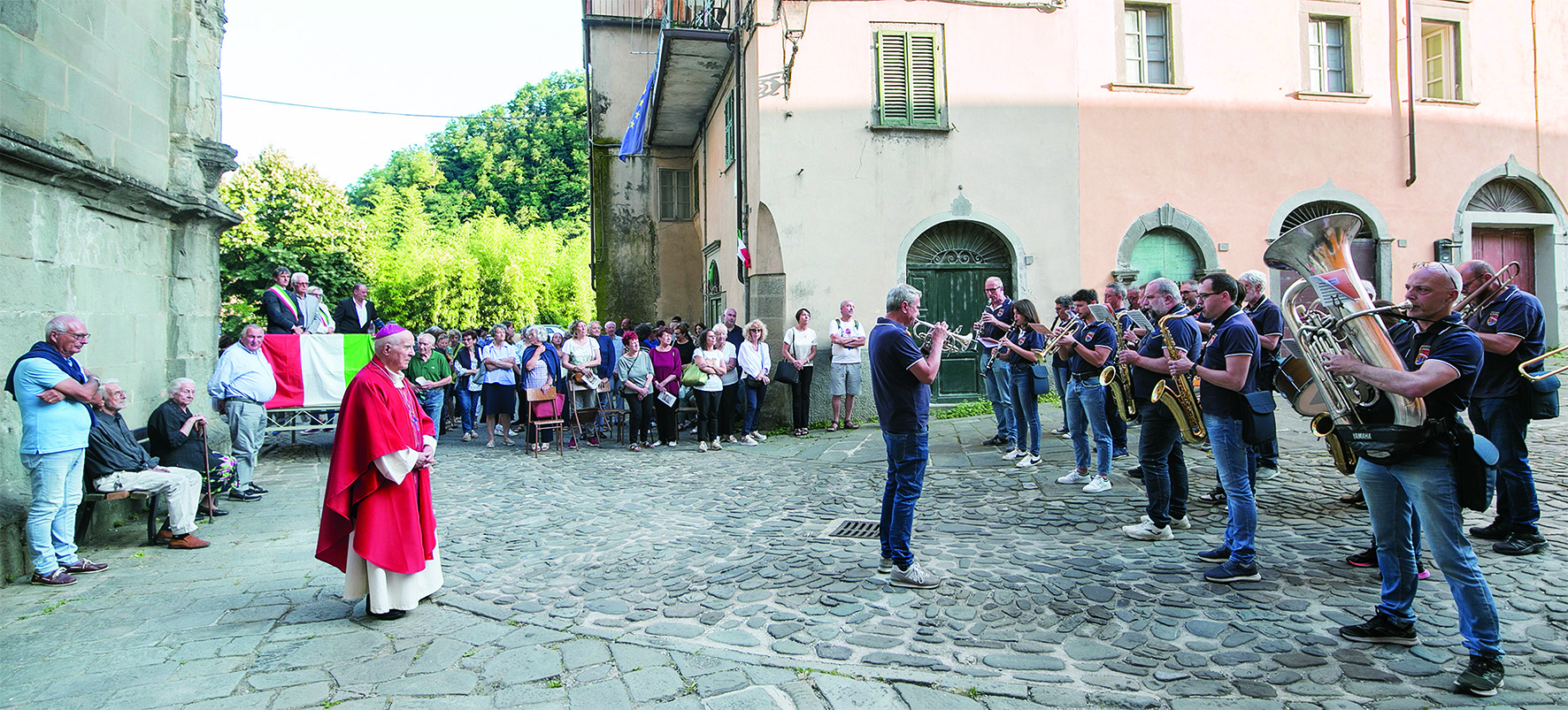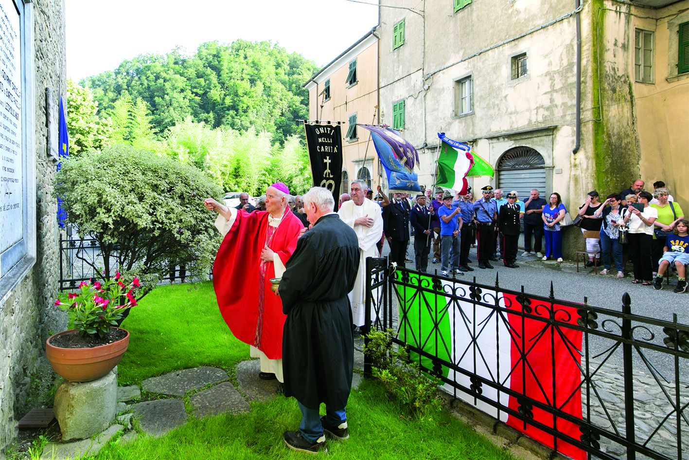 I cinque “martiri” di Ponticello sono stati ricordati con solennità anche nel borgo della SS. Annunziata, loro luogo di origine; qui, sul prospetto nord della chiesa, riposano dal giugno 1945 quando i corpi erano stati riesumati dalla fossa comune che li aveva accolti tre giorni dopo l’eccidio e trasportati con un lungo corteo. Alle 18 di sabato 6 luglio il parroco don Lorenzo Piagneri ha accolto mons. Eugenio Binini, ricordando come già nel 1994 fosse intervenuto alla cerimonia nel 50.mo anniversario. Il vescovo emerito della nostra diocesi ha presieduto la celebrazione eucaristica, ricordando il valore della pace della non violenza, dell’accoglienza e della condivisione.
