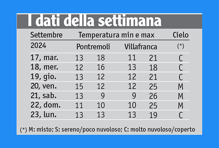 La pioggia, una volta tanto decisa a non sbugiardare i meteorologi, ha preso a scendere giusto tra le 11 e le 11,30 di lunedì 24. Precipitazioni di maggiore intensità, anche temporalesche, messe in conto per il pomeriggio e la serata, non hanno infierito sulla Lunigiana e i tuoni si sono uditi quasi sempre piuttosto lontani, in direzione della costa.