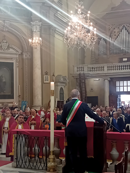 La Santa Messa delle ore 17 è stata celebrata dal vicario don Marino Navalesi coadiuvato dal parroco don Andrea, don Giovanni Poggiali, don Angelo e dai diaconi. Presente il sindaco Giovanni Guastalli con la Giunta al completo, i consiglieri di minoranza, i rappresentanti delle associazioni di volontariato e delle varie parrocchie del territorio, con i loro labari; maestranze civili e militari, con carabinieri in alta uniforme.
