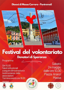 In occasione del Giubileo della Speranza, la Caritas Diocesana di Massa Carrara – Pontremoli organizza per sabato 24 maggio, dalle ore 10 alle ore 18 in piazza Aranci a Massa, il “Festival del Volontariato – Donatori di Speranza”.