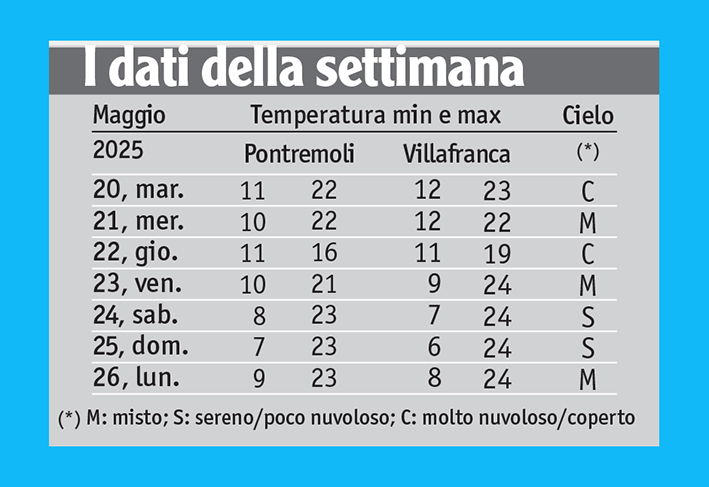 Nella settimana in esame, non si sono rilevati giorni di acuto maltempo, ma piovaschi e piogge moderate non sono mancati; con il week-end, invece, l’agognato connubio di cielo sereno o poco nuvoloso e ventilazione a regime di brezza si è imposto proprio sabato 24 e domenica 25. La decade centrale si era conclusa, martedì 20, con nuvole e piovaschi sparsi sotto lo spirare di vento da S-SE.