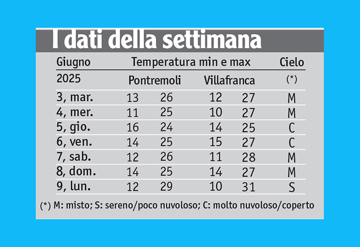 Pur mancando, al momento di andare in pagina, i dati definitivi di oggi (martedì 10, ndr) per stilare la media della prima decade di giugno, si può anticipare un piazzamento superiore alla norma di circa 1,5°C per le minime e quasi 2°C per le massime.