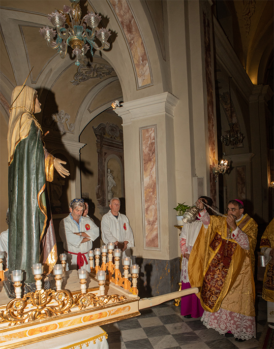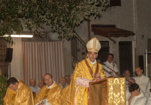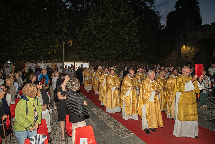 Alle ore 21, solenne Pontificale, in piazza Castello, presieduto da mons. Alfonso Vincenzo Amarante, arcivescovo titolare di Sorres e Rettore della Pontificia Università Lateranense. Presente il nostro vescovo mons. Mario Vaccari con tanti confratelli, diaconi, ministranti. Autorità civili, militari, rappresentanti di Associazioni di volontariato ed Alpini. Dopo la proclamazione del Vangelo la sindaca Annalisa Folloni, affiancata dal vicesindaco Giuliana Filippi e dalla Polizia comunale con il gonfalone, ha offerto il cero votivo, nel solco degli avi, acceso davanti all’immagine della Madonna. Molto incisiva l’omelia.
