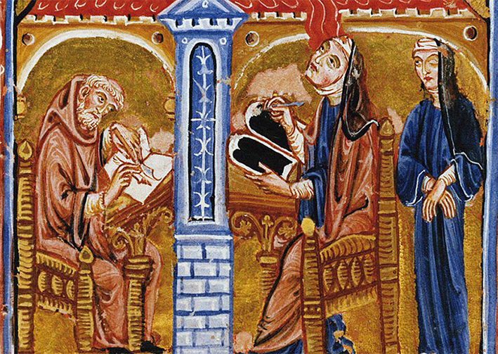 Una delle visioni di Ildegarda di Bingen che la descrive al suo segretario (tratto dal manoscritto Scivias del 1162 – da Wikipedia)