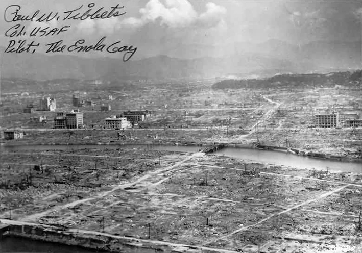 La distruzione a Hisoshima dopo l’eplosione della prima bomba atomica sganciata dal B-29 degli Stati Uniti (da Wikipedia)