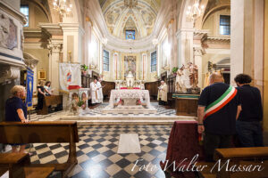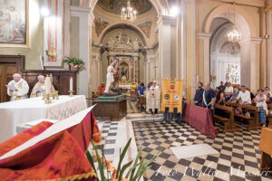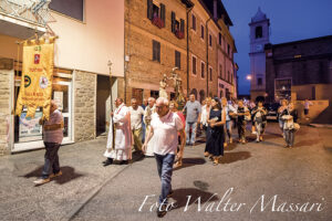 Presente il sindaco Filippo Bellesi con fascia tricolore (come durante la S. Messa del mattino) affiancato dal vicesindaco Loris Bernardi. Labari delle varie associazioni con i loro rappresentanti. “L’Inno che abbiamo cantato, dedicato al Battista, ha sottolineato mons. Antonio, esprime la bellezza della liturgia e la millenaria storia della musica gregoriana che, prima dell’arrivo del Protestantesimo, univa davvero l’Europa cristiana anche mediante la lingua latina: palestra mentale e scrigno di fede”.