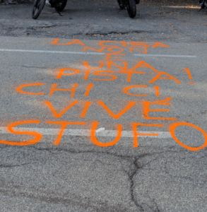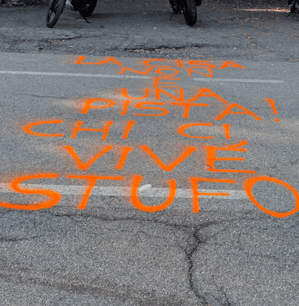 Una scritta di protesta sulla Statale in occasione del raduno in ricordo di Marco Simoncelli