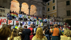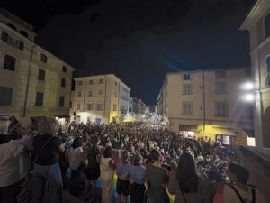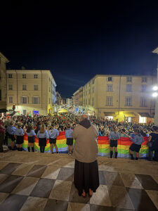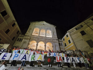 Giunti sulla scalinata della Cattedrale, mentre la sottostante via Dante conteneva a malapena tutti i manifestanti, le bandiere si sono trasformate nella frase “Se vuoi la pace prepara la pace”: una frase densa di significato, tesa a indicare la necessità di intraprendere azioni concrete per costruire una cultura di pace, riaffermare i diritti umani e relazioni basate su principi di uguaglianza, promuovere la nonviolenza come difesa popolare, prendersi cura della casa comune e tessere il dialogo tra i popoli e le religioni.