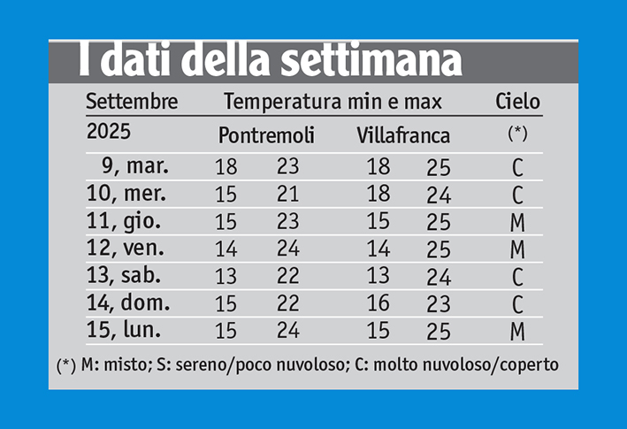 In attesa di rivedere giornate dal soleggiamento più generoso, resta da entrare più in dettaglio nel descrivere l’episodio perturbato del 9-10 settembre, che era ancora nelle fasi iniziali martedì scorso quando il giornale è andato in stampa. I rovesci più intensi si manifestavano, infatti, nel mezzodì e a metà del pomeriggio: questo, dopo i forti nubifragi che, nelle prime ore del mattino, si erano abbattuti lungo la costa e la prima fascia collinare apuana provocando le piene di Parmìgnola e Carrione e l’allagamento dei sottopassi della stazione ferroviaria di Massa.