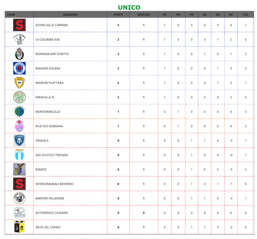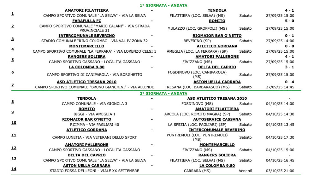 Per quanto riguarda questa prima giornata bella vittoria degli Amatori Filattiera contro il Tendola per 4 a 1 e anche dall’altra parte del Magra festeggia il Farafulla FC 5 a 0 sul Romito. Sconfitta invece per il Delta Caprio, che si arrende per 3 a 1 a La Colomba, e per l’Atletico Tresana superato in casa dall’Aston Uella Carrara. Pari a rete bianche invece per l’Atletico Gordana sul campo del Montemarcello. Nel quasi inevitabile derby che ci sarà praticamente in quasi tutti i turni, il Ranger Soliera ha la meglio sugli Amatori Pallerone per 4 a 1.