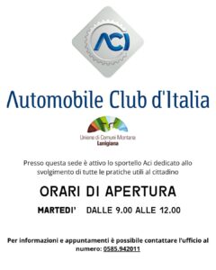 Grazie a una collaborazione tra ACI e l’Unione di Comuni Montana Lunigiana, è attivo a Fivizzano, presso la sede dell’Unione in Piazza De Gasperi 17, lo Sportello ACI, a disposizione dei cittadini per l’erogazione dei principali servizi automobilistici e amministrativi.