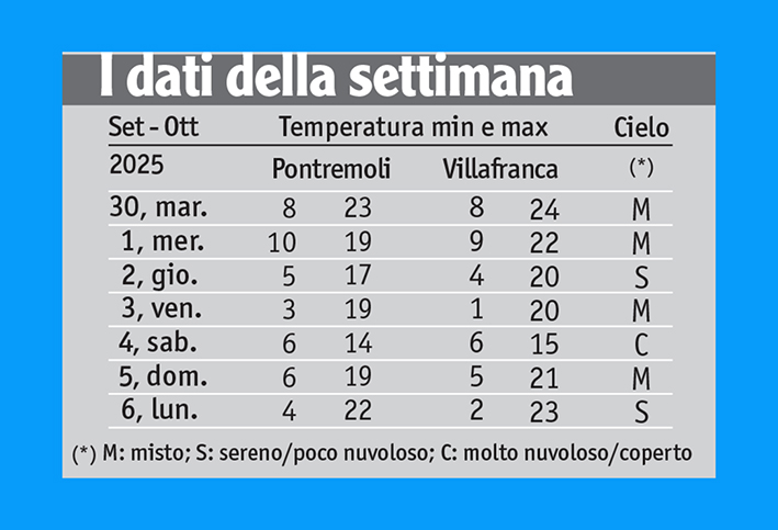 A Pontremoli, dove settembre, negli ultimi trent’anni, ha proposto in media temperature di 11,7°C, 23,7°C e 17,7°C rispettivamente nelle minime, massime e medie giornaliere, gli scostamenti dalle normali suddette sono risultati +0,9°C, +0,3°C e +0,6°C: tutti positivi, dunque, ma piuttosto contenuti, segnatamente nei valori massimi. Due conti veloci e si ottengono i dati del settembre 2025: media delle temperature minime 12,6°C, media delle massime 24,0°C e media mensile di 18,3°C.