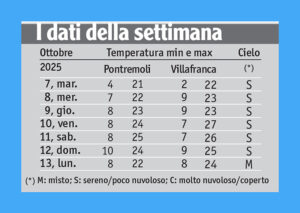 Lunedì 20 le previsioni annunciano pioggia: si approderà alla svolta con giornate ancora buone, benché meno sfavillanti di sole, come quella di martedì 14 che ha visto il cielo ospitare una certa nuvolaglia e l’aria appena mossa da un vento discendente che non si può certo denominare tramontana.
