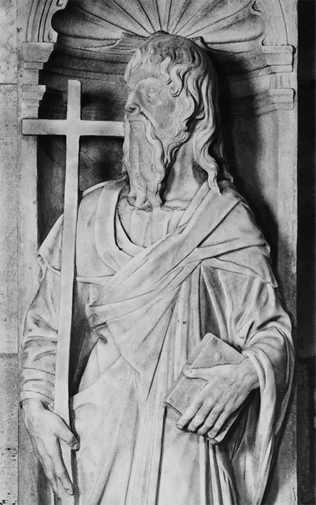 Sant’Andrea (come San Giovanni Battista) è collocato all’interno di una nicchia, raffigurato nelle vesti di apostolo: con la mano destra sostiene una croce mentre nella sinistra stringe il libro. Difficile oggi immaginare la solennità di quell’altare che per due secoli campeggiava nel presbiterio: come ricorda Caterina Rapetti (“Storie di marmo”, Electa 1998) “le figure emergevano ad altorilievo, come attestano due elementi pervenutici, entro nicchie culminanti in una valva di conchiglia, e alternate a colonne tortili di cui permangono in basso elementi dei plinti”.