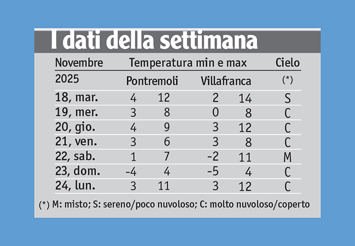 Martedì 18, unico giorno dal cielo poco nuvoloso della settimana in esame, ha preso le mosse il calo termico recato dai venti di tramontana. L’effimera schiarita era destinata a non durare e, con l’aria ferma e freddo-umida di mercoledì 19, si sono riaffacciate pioviggine e pioggerella tra pomeriggio e sera. Meno plumbeo è stato il meteo di giovedì 20, con pioggia ad intervalli, qualche saluto del sole e un po’ di neve ai monti oltre i 900-1000 m, specie ai Due Santi, al Brattello e alla Cisa.
