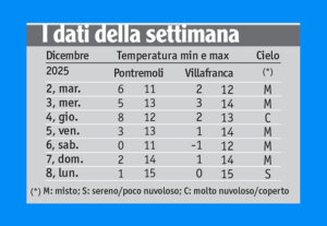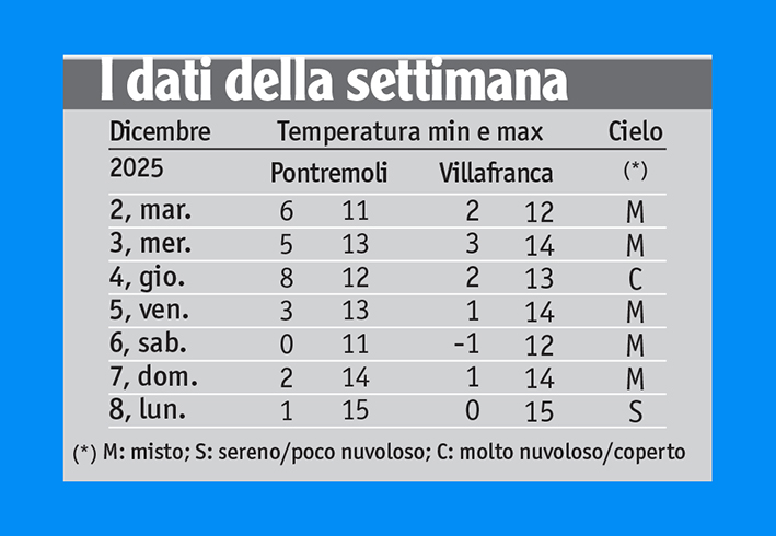 Le temperature, fino a lunedì 8, oscillavano in media tra 2 e 4°C al di sopra della norma, mentre martedì 9, si sono allineate ai canoni climatici nel fondovalle interno. Questo, però, solo per la copertura nuvolosa subentrata al cielo sereno proprio all’aurora, nell’orario in cui, al minimo possibile di temperatura realizzatosi, succedono condizioni favorevoli per avere, nelle ore successive, una massima anch’essa inferiore alla norma.