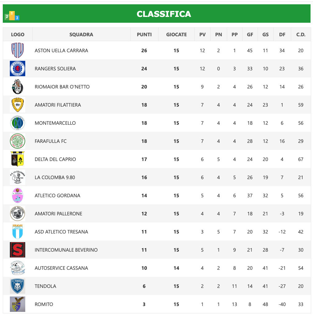 Così l’ASD Atletico Tresana 2010, si è arresa in casa della capolista Aston Uella Carrara, superata per 4 a 0. Mentre il derby tra Amatori Pallerone e Rangers Soliera è andato di misura alla seconda della classe con i fivizzanesi che hanno superato di misura (0 a 1) la squadra di casa di Pallerone. C’è poi l’ottimo pareggio casalingo dell’Atletico Gordana che impatta per 2 a 2 con il Montemarcello, e per finire due belle vittorie: quella dell’Amatori Filattiera che sbanca il campo del Tendola (1 a 4) cui si aggiunge un altro successo esterno quello Farafulla FC che supera per 0 a 2 il Romito.