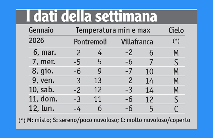 Della settimana trascorsa, vale la pena ricordare le luminose giornate di mercoledì 7 e domenica 11, distintesi per la perfetta serenità del cielo, la vista eccezionale e la secchezza dell’aria. Più rigido il 7, anche in pieno giorno, a motivo della tramontana di estrazione continentale, e più mite l’11 a causa della natura più favonica del vento, peraltro avente la stessa direzione da N-NW del 7.