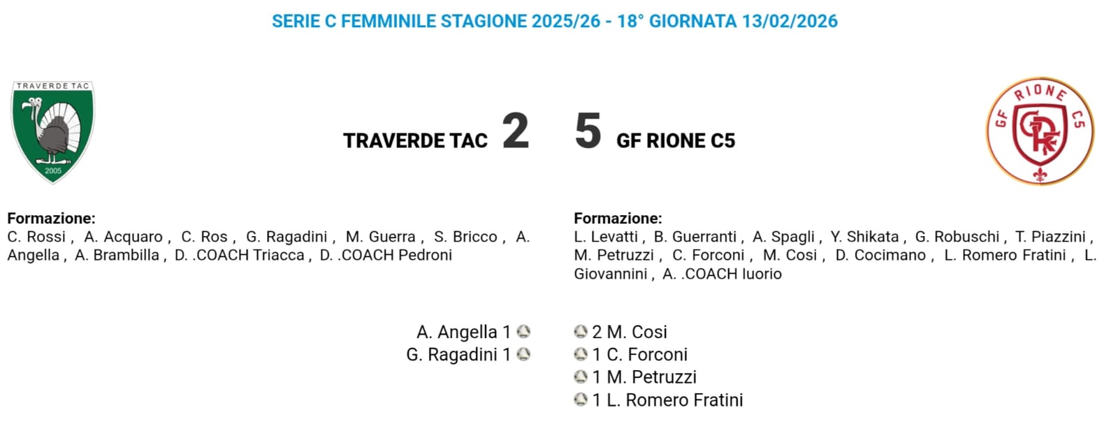 Nel momento migliore del Traverde però è il Rione a fissare il primo tempo sull’1-3 grazie ad una ripartenza che porta il laterale destro a segnare in contropiede. Nella ripresa le padrone di casa tentano la rimonta con un gol di rapina di Ragadini, un gol fantasma non assegnato ad Angella, che poi non concretizza un’assist dopo cavalcata sulla fascia sinistra di Bricco e il contropiede della coppia Angella-Guerra sprecato sul più bello.