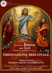 Domenica 1° marzo, alle ore 18,30, in Cattedrale a Massa, si svolgerà una solenne celebrazione per l’ordinazione diaconale di Diego Bassi e Filippo Lijth Vattakkattil.