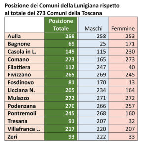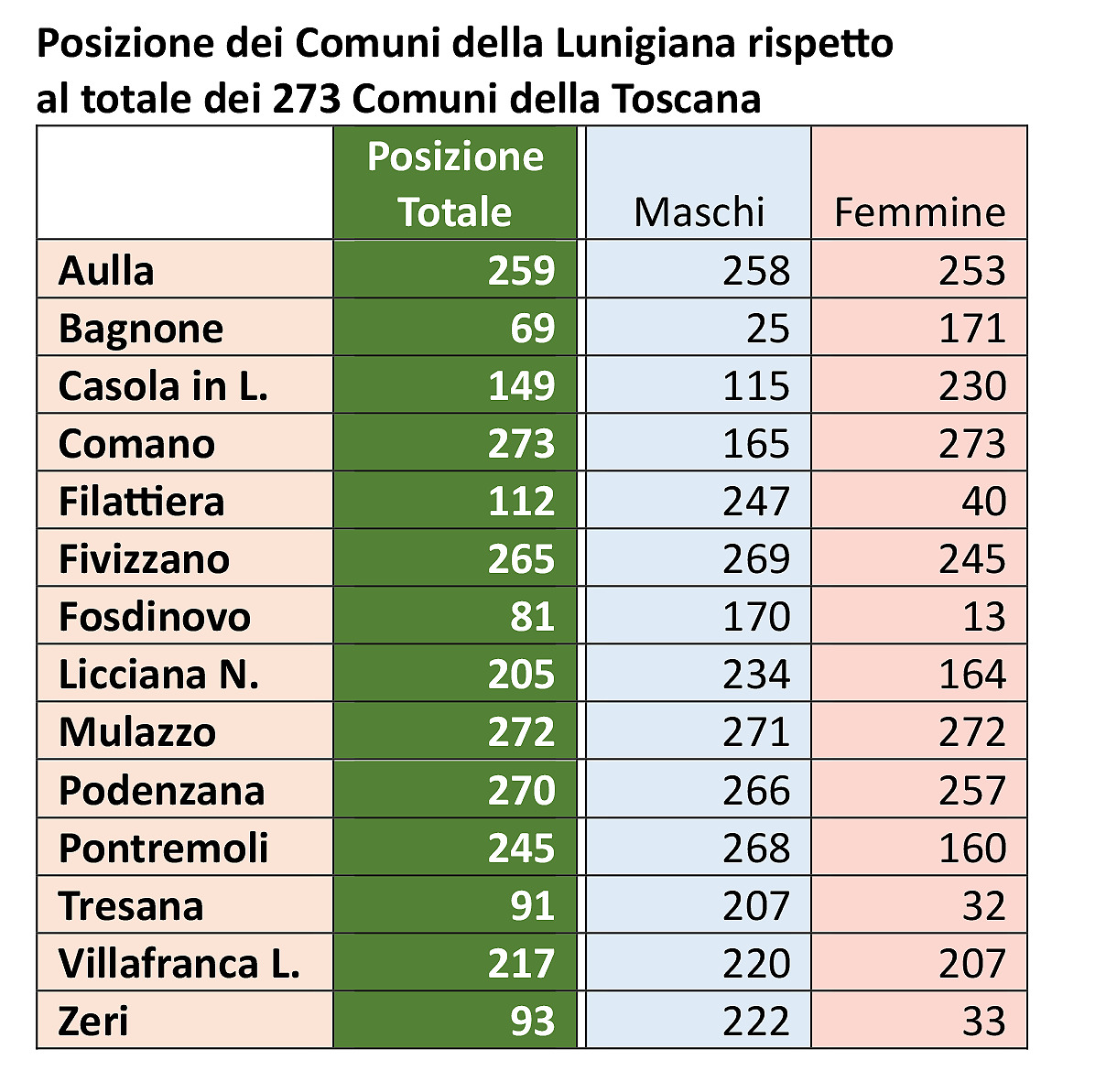 Dal confronto con il totale della Toscana, i Comuni lunigianesi che, secondo i dati e nel loro complesso, evidenziano uno stato della salute migliore sono Bagnone, Fosdinovo, Tresana e Zeri, tutti nelle prime cento posizioni; quelli che stanno peggio sono Comano, Mulazzo, Podenzana, Fivizzano, Aulla e Pontremoli, tutti nelle ultime trenta posizioni. In alcuni casi la situazione si modifica anche in modo significativo se si guarda la graduatoria riferita non al complesso dei dati bensì a quelli relativi ai singoli generi, maschile e femminile.