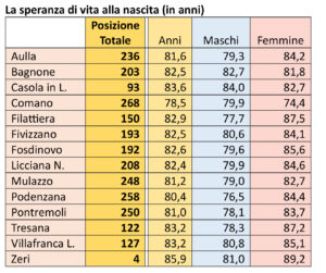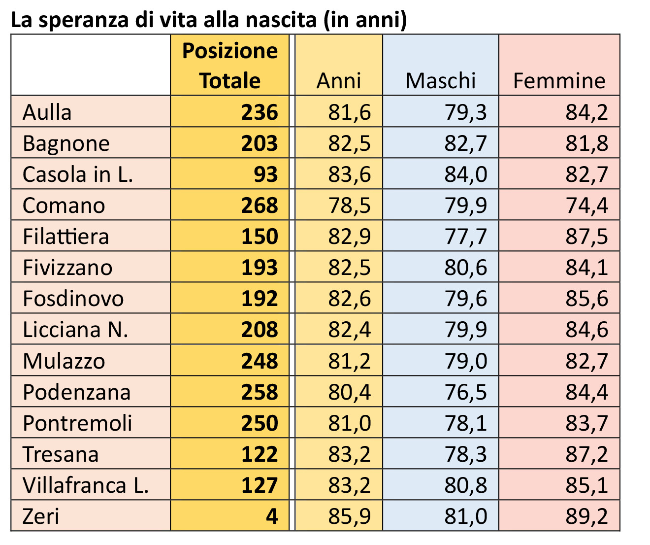 Per quello che riguarda invece l’aspettativa di vita alla nascita, il territorio dove la prospettiva sembra essere di gran lunga migliore è quello di Zeri, al quarto posto in questa particolare graduatoria. Chi nasce nelle vallate fra Toscana, Liguria ed Emilia può sperare di vivere fin quasi a 90 anni se donna e quasi a 86 anni se uomo. Nelle prime cento posizioni anche Casola (93): per gli uomini una speranza di vita di 84 anni, poco meno per le donne (82,7). Invece nelle parti più basse della classifica ci sono Podenzana, Pontremoli e Mulazzo dove l’aspettativa media varia fra 80,4 e 81,2, mentre Comano è al 268° posto con un’aspettativa di vita alla nascita di 78,5 anni.