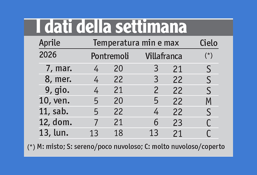 In aprile, sono da mettere in conto 130-140 mm, distribuiti in una dozzina di giorni. In Lunigiana, a fondovalle, i mesi di aprile più piovosi superano i 300 mm e quelli da primato oltrepassano i 400 mm; tali copiosi apporti arrivano a interessare 20-22 giorni sui 30 del mese, come accaduto ad esempio nel 1879, 1918, 1956, 1989, 1998 e 2012.