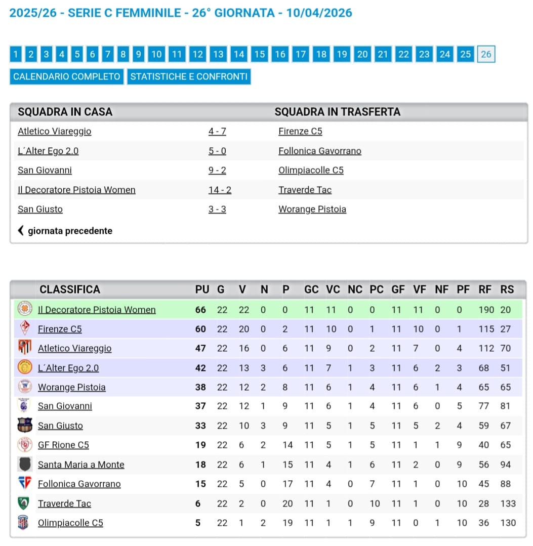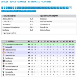 Grande festa e terzo tempo a Pistoia al fischio finale dell’ultima giornata del campionato di serie C femminile di futsal. Le padrone di casa del Decoratore brindano ad un campionato dominato a punteggio pieno, solo vittorie, senza mai commettere un passo falso.
