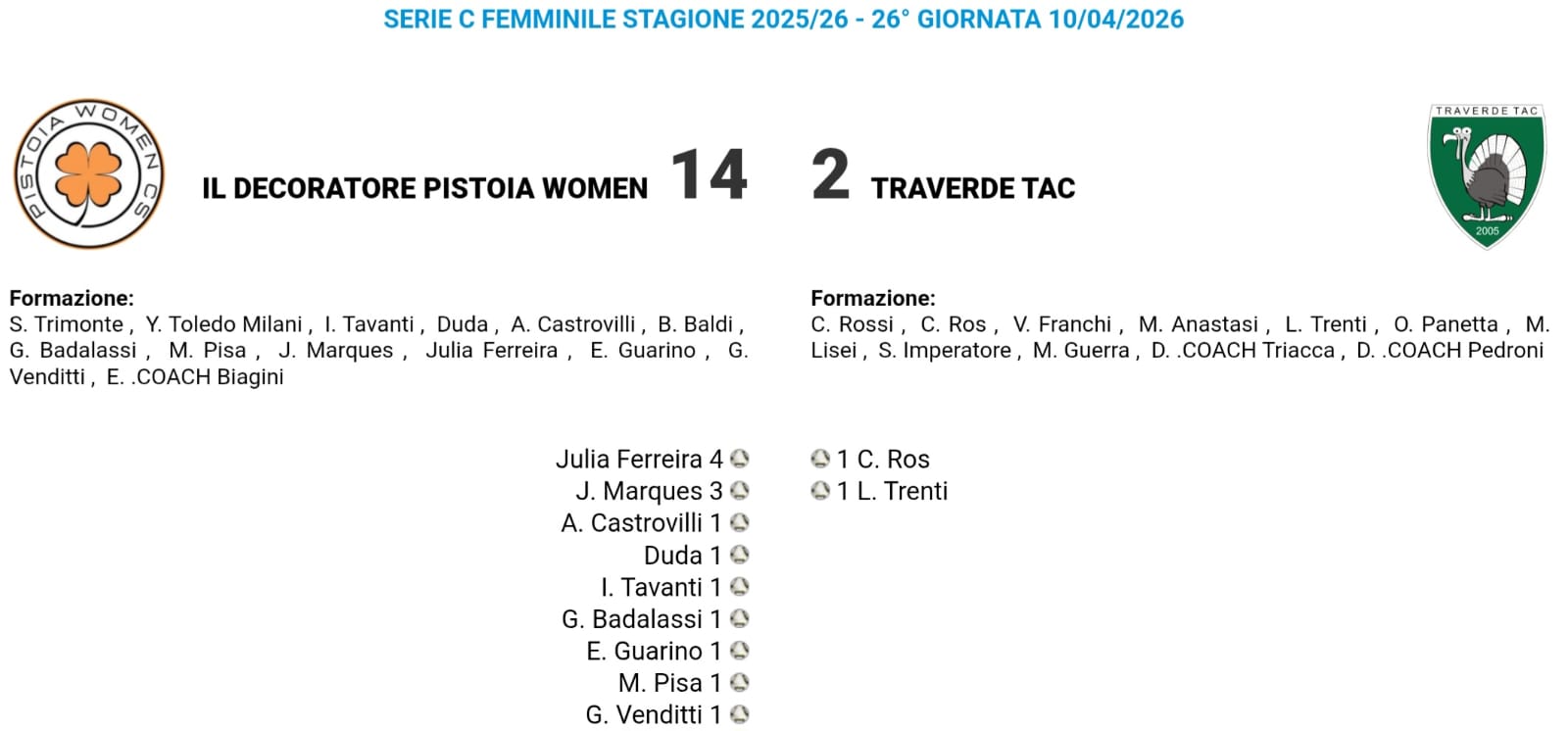 Il Traverde TAC festeggia il penultimo posto in classifica, niente male per una squadra all’esordio assoluto in figc, che è riuscita, vincendo gli scontri diretti, a tenere dietro le rivali dell’Olimpiacolle. La partita si fa’ subito difficile per le lunigianesi che tentano, spesso inutilmente, di arginare la corazzata pistoiese, ma il divario è enorme, contro una squadra che paga giocatrici di “mestiere” e vanta fra le sue fila diverse atlete brasiliane molto tecniche, prima su tutte il bomber Jessica Marques, capocannoniere assoluto della competizione con 74 gol.