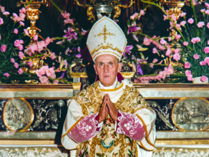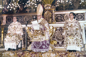 Pontremoli, 15 settembre 1979: il Vescovo mons. Fenocchio, in Cattedrale, presiede la cerimonia di ordinazione sacerdotale di Antonio Costantino Pietrocola. I due diaconi al suo fianco sono mons. Antonio Panfili (a sinistra), attuale vicario episcopale per le religiose e i religiosi, mentre a destra è l’attuale card. Angelo De Donatis, penitenziere maggiore.