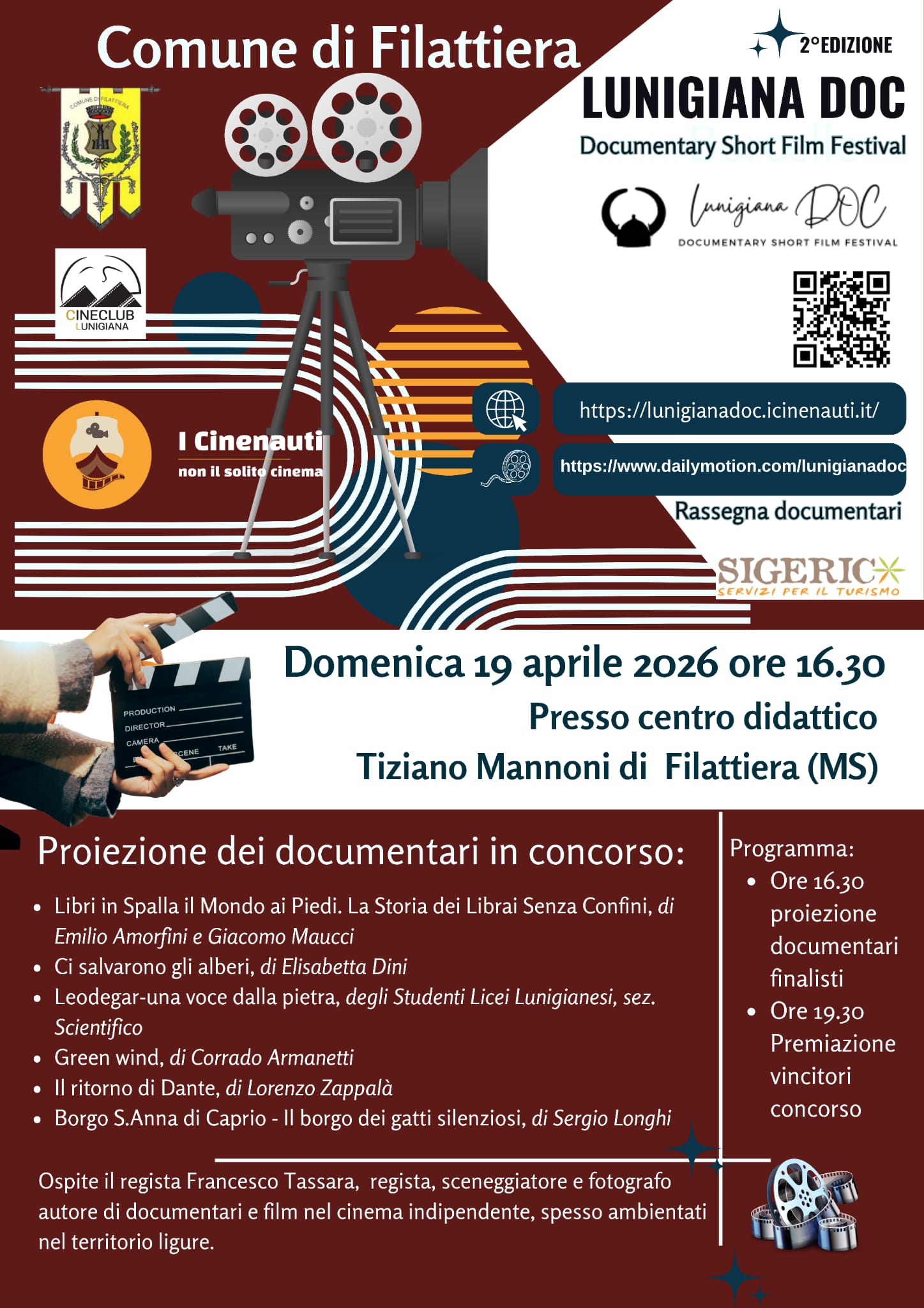 Ospite della giornata il registra Francesco Tassara, autore di documentari e film nel cinema indipendente, spesso ambientati nel territorio ligure. Attorno alle 19,30 è prevista premiazione vincitori del concorso. Sono previste le seguenti categorie di Premi con targhe ed opere d’arte: Miglior cortometraggio, Miglior cortometraggio naturalistico o paesaggistico, Miglior cortometraggio storico od etnografico, Miglior fotografia, Miglior montaggio, Miglior regia.