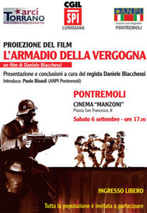 Sabato, 6 settembre, alle ore 17, a Pontremoli, nel Cinema “Manzoni”, sarà proiettato il film di Daniele Biacchessi “L’armadio della vergogna”, incentrato sulla vicenda delle carte relative alle inchieste sulle stragi e i crimini di guerra compiuti dai nazifascisti nei mesi della occupazione fra il 1943 e il 1945.